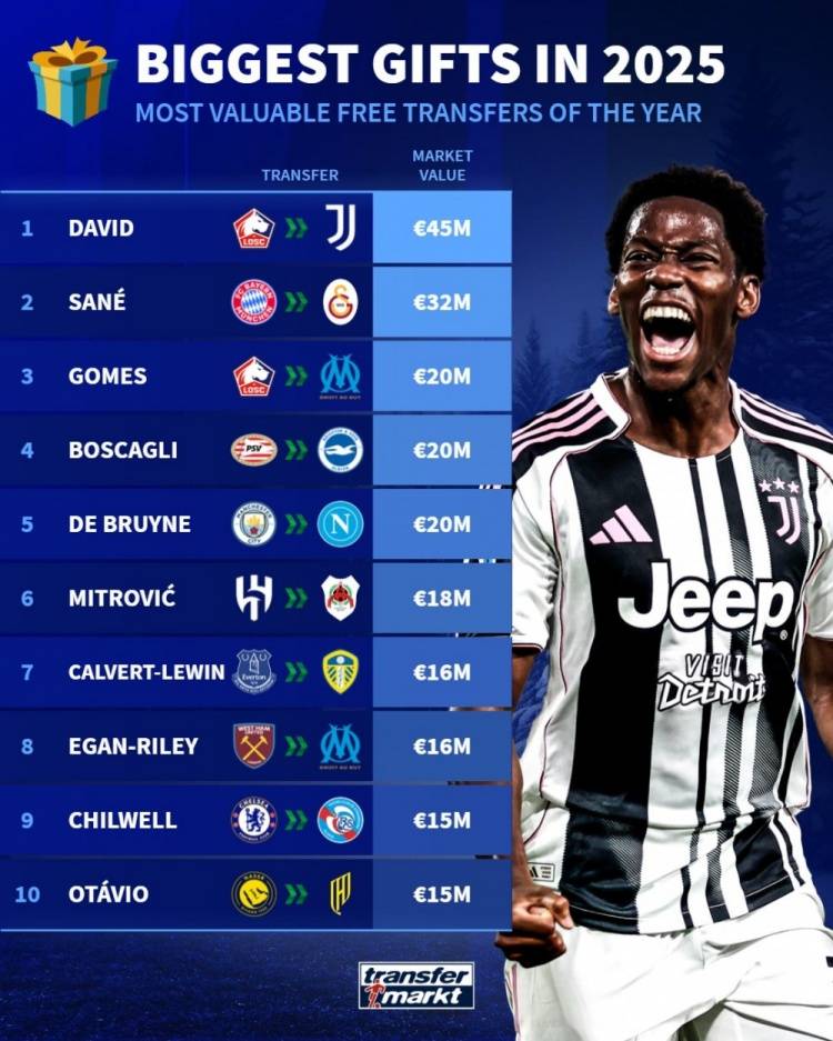 24直播网北京时间12月26日,德国《转会市场》给出了2025年自由转会球员目前的身价排行榜,尤文的乔纳森-戴维以4500万欧居首,加拉塔萨雷的萨内3200万欧次席。从曼城加盟那不勒斯...
